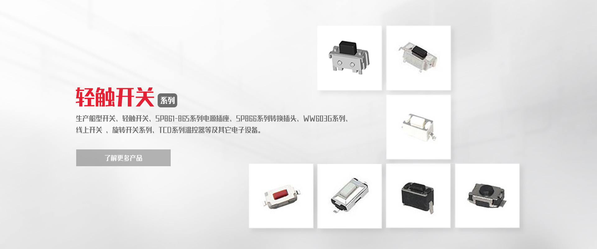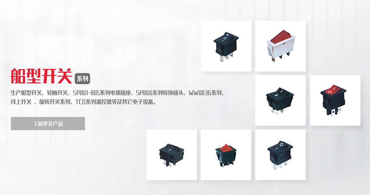 公司專業(yè)生產(chǎn)船型開關、輕觸開關、SP861-865系列電源插座、SP866系列轉(zhuǎn)換插頭、WW11系列微動開關、WW01-03、09系列按鈕開關DS、WW系列指示燈開關、WW603G系列 線上開關 、旋轉(zhuǎn)開關系列、TCD系列溫控器等及其它電子設備。